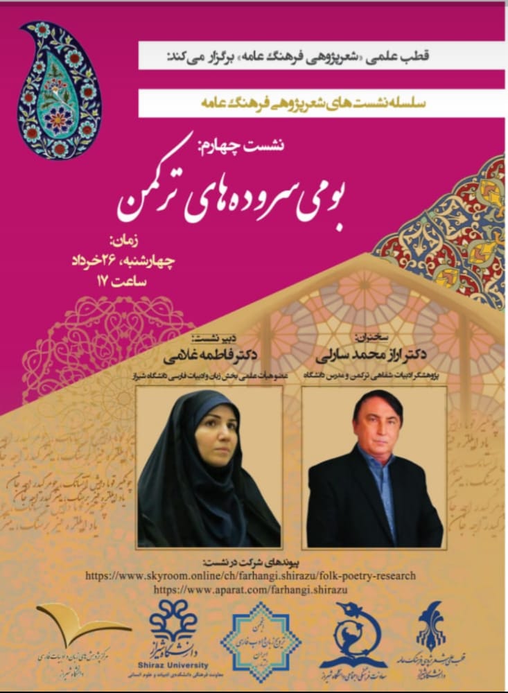 دکتر اراز محمد سارلی، مدرس دانشگاه که خود مجری طرح «بومی سرودههای ترکمنی» است، سخنران و دکتر فاطمه غلامی عضو هیأت علمی دانشگاه شیراز دبیر نشست بود.
